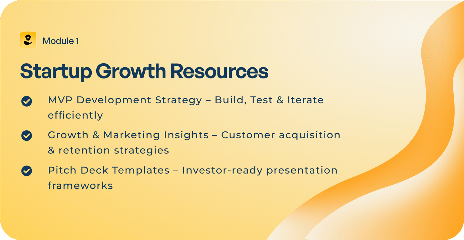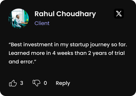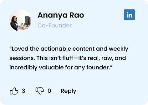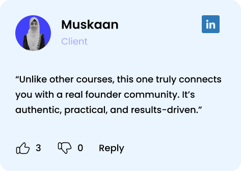 You will master startup fundamentals — from developing a founder’s mindset, validating your ideas, building your MVP, to understanding the basics of customer acquisition and fundraising.